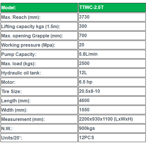The loading crane, included as part of delivery, has a swivel range of 270 degrees and a maximum reach of 3.2m. At the maximum jib length of 3.7m, the crane has a lifting capacity of 300kg. The crane has a hydraulic grab which can rotate 360 degrees.