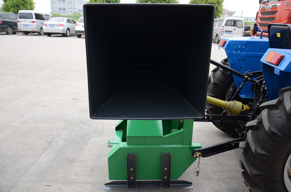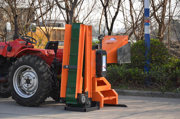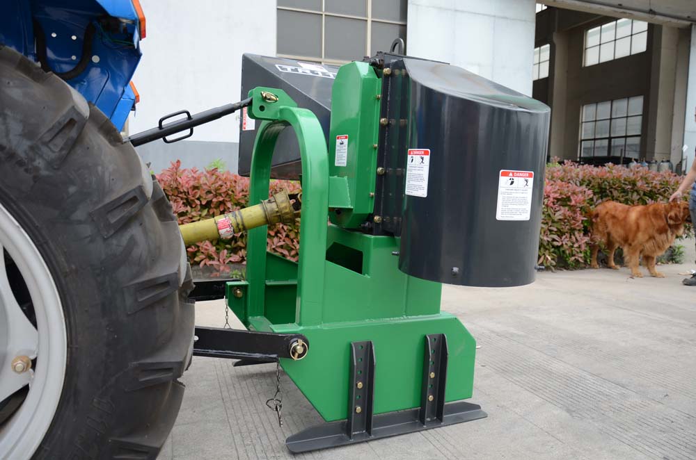 The TR110 Branch logger is mounted on the rear three-point hitch on the tractor.
